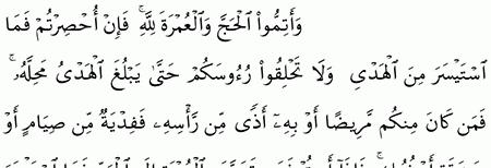 و أ ت م وا ال ح ج و ال ع م ر ة ل ل ه ف إ ن أ ح ص ر ت م ف م ا اس ت ي س ر م ن ال ه د ي و ل ا ت ح ل ق وا ر ء وس ك م ح ت ى ي ب ل غ ال ه د ي م ح ل ه ف م ن ك ان م ن ك م م ر يض ا أ و ب ه أ ذ ى م ن ر أ س ه ف ف د ي ة م ن ص ي ام أ و